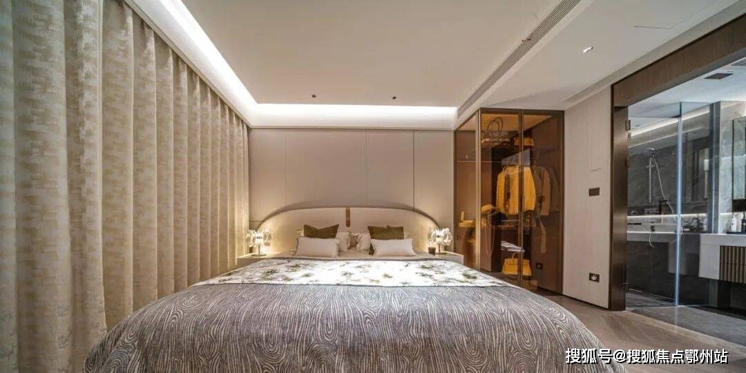 在大平层户型中最容易被忽视的主卧套房的格局,设计上更是给足了尺度,再加上转角窗的设计。