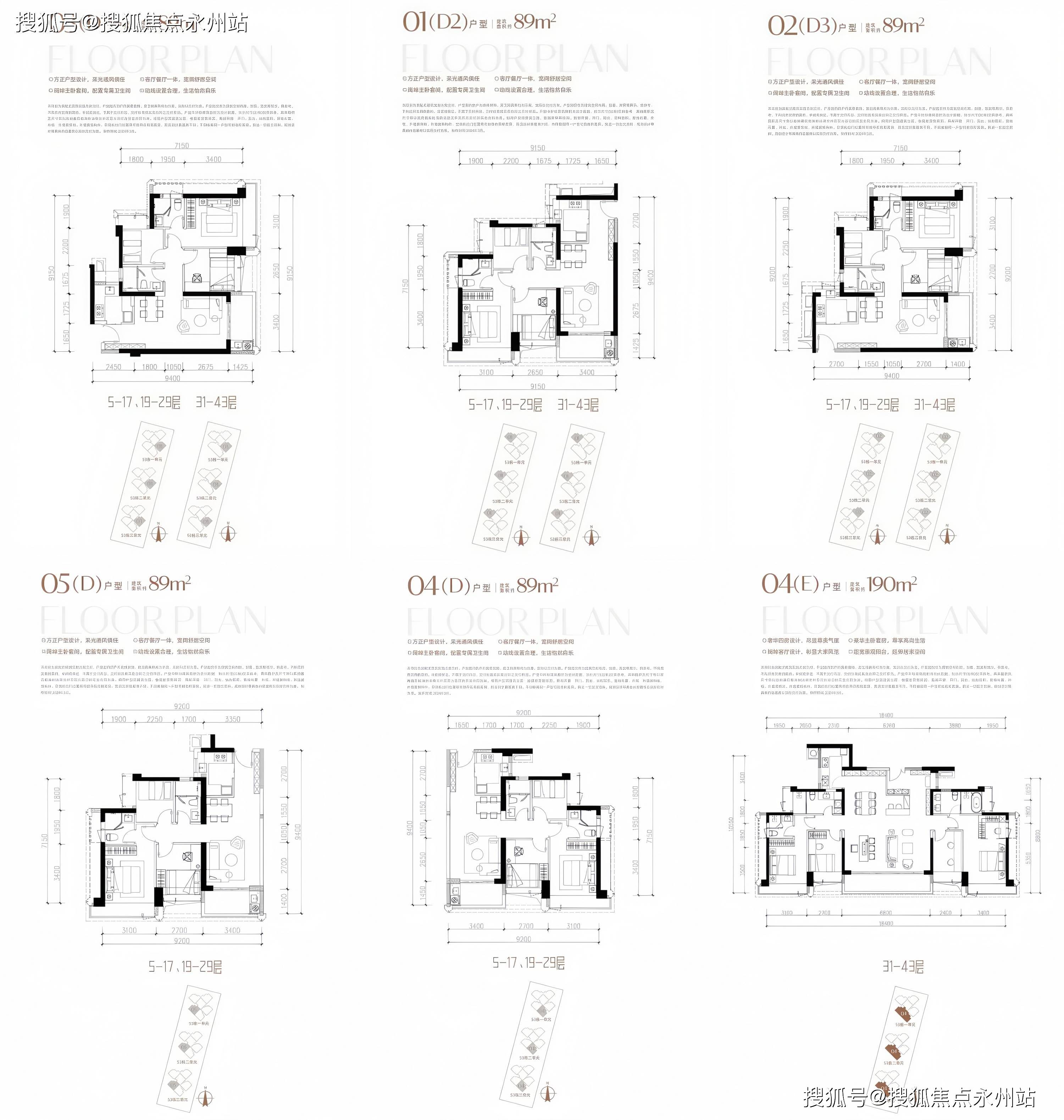 89-190㎡3-4房,楼栋结构均为中低区3T5,高区3T4,高度为43F。户型有约89㎡三房二卫,高区有约190㎡四房三卫,由两个D户型合并而成。